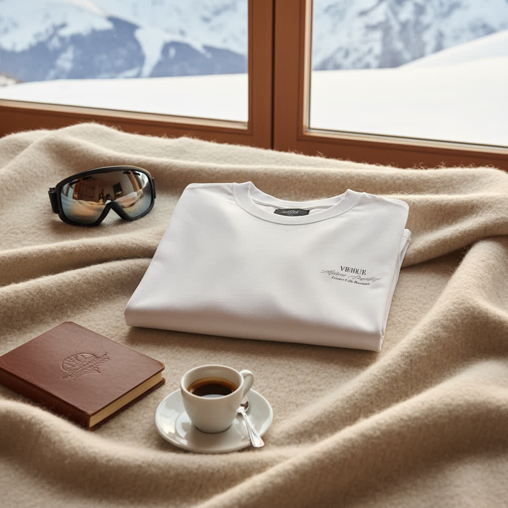 This white oversized tee captures the calm sophistication of luxury chalets and snowy mountain views. Perfect for après-ski comfort or elegant casual outfits, it represents modern Alpine lifestyle and the discreet prestige of European winter resorts.