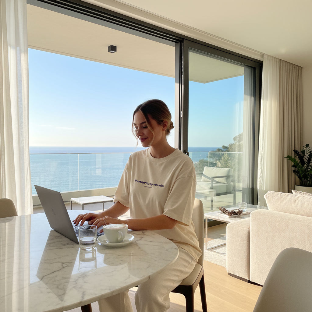The Working for My New Villa T-shirt celebrates the dreamer’s mindset — elegant, confident and effortlessly relaxed.
